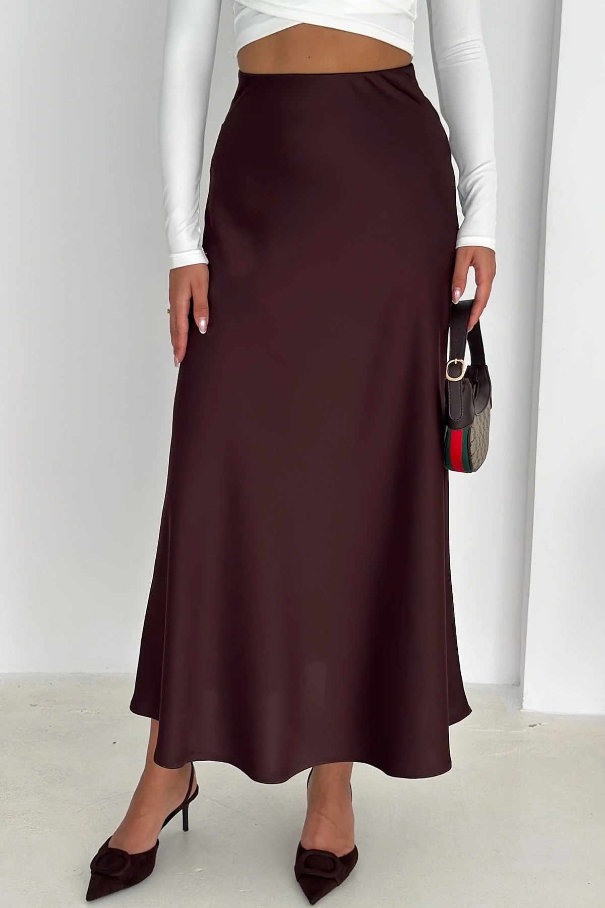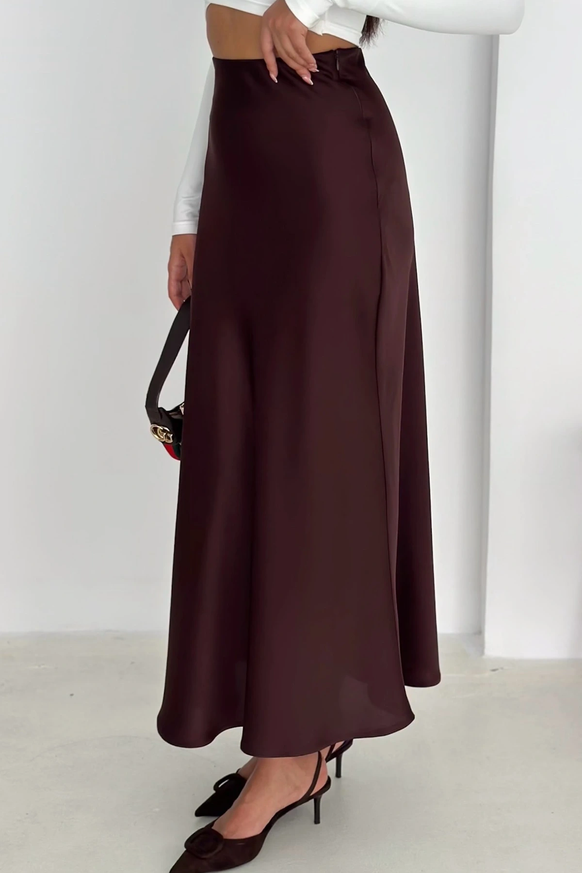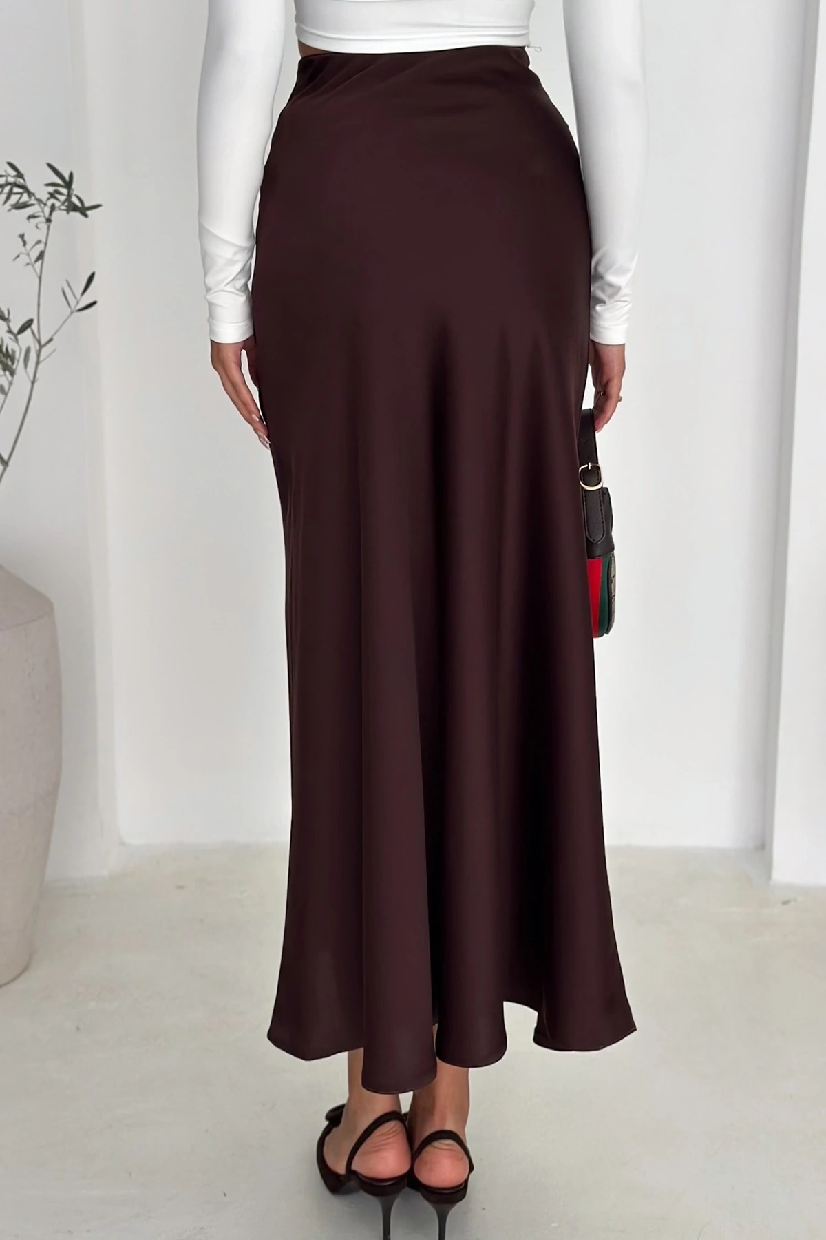 Acı Kahve Yanı Fermuarlı Çan Dökümlü Saten Etek