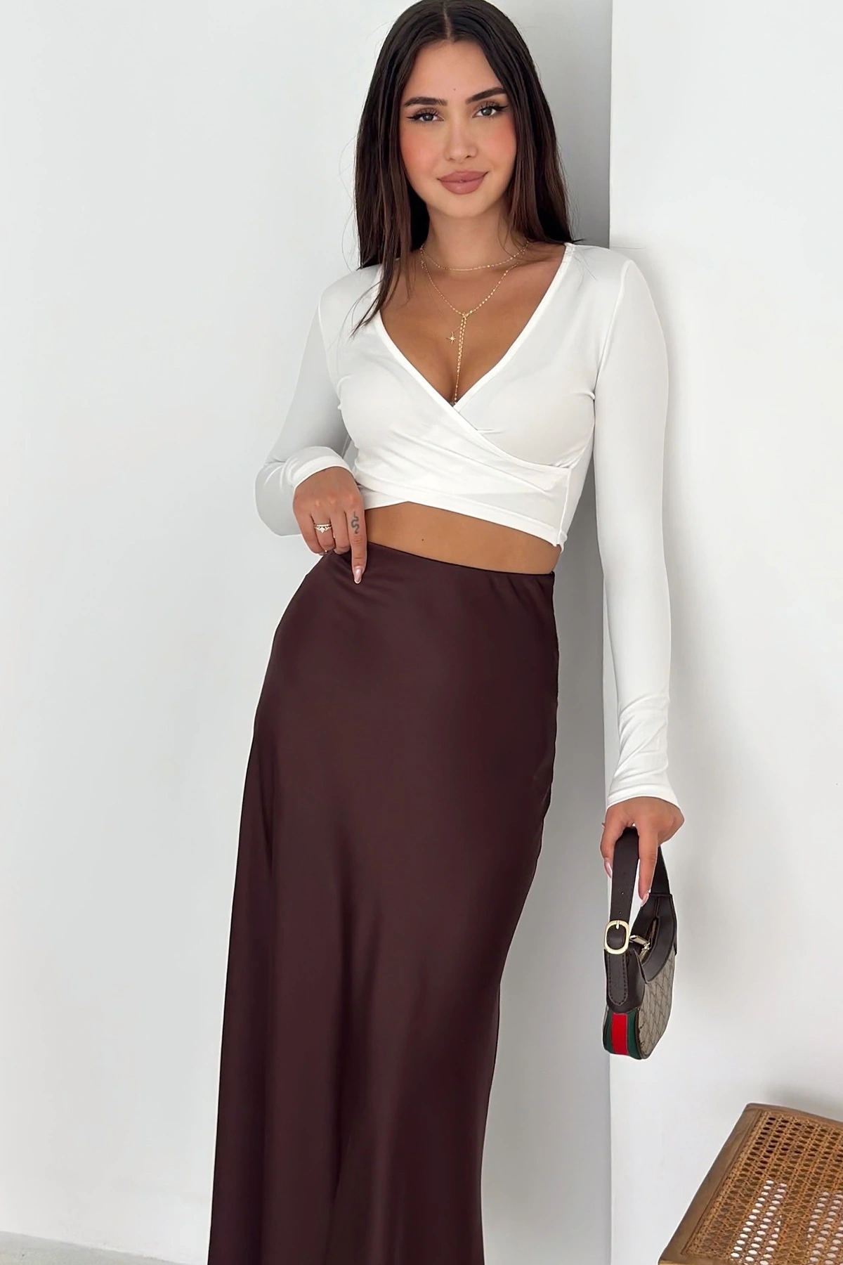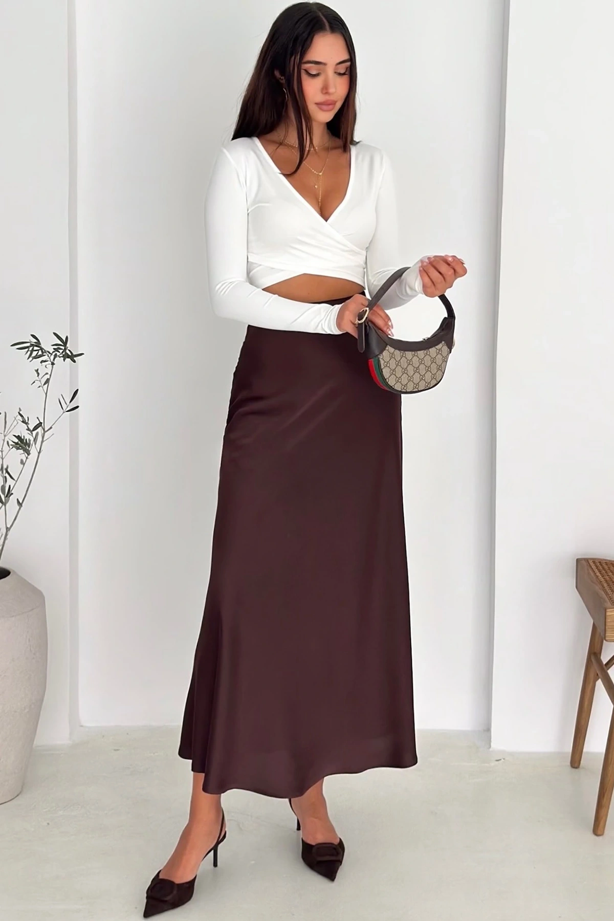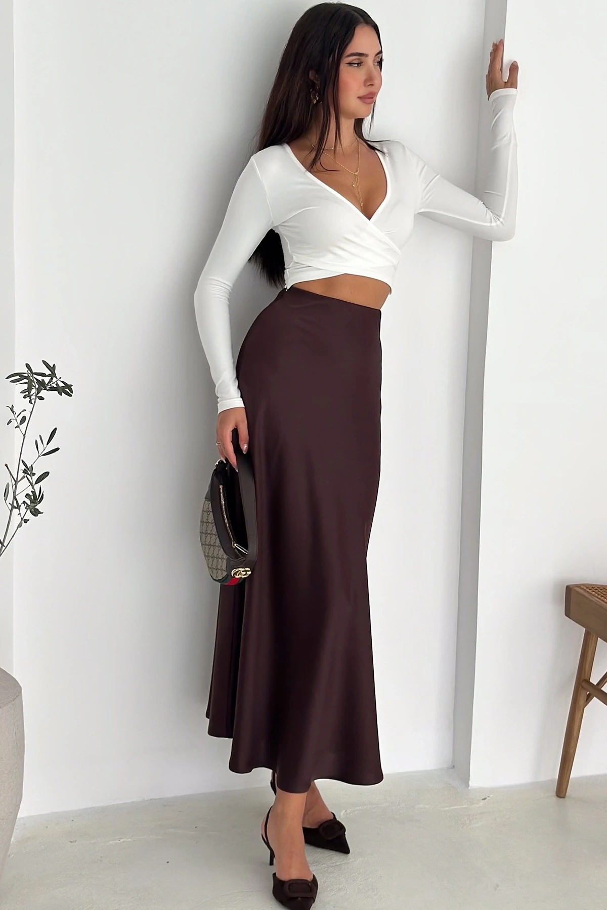 Acı Kahve Yanı Fermuarlı Çan Dökümlü Saten Etek