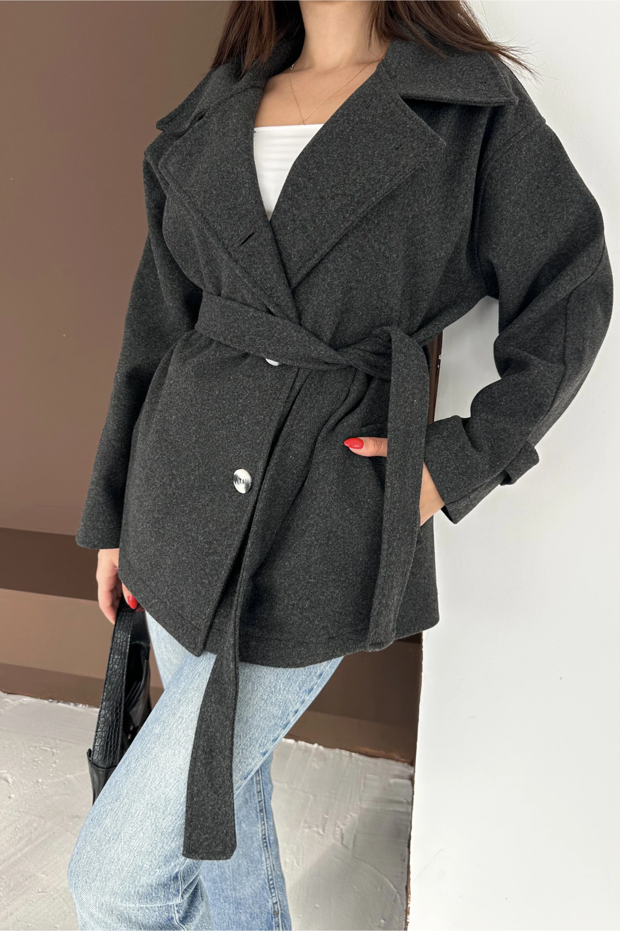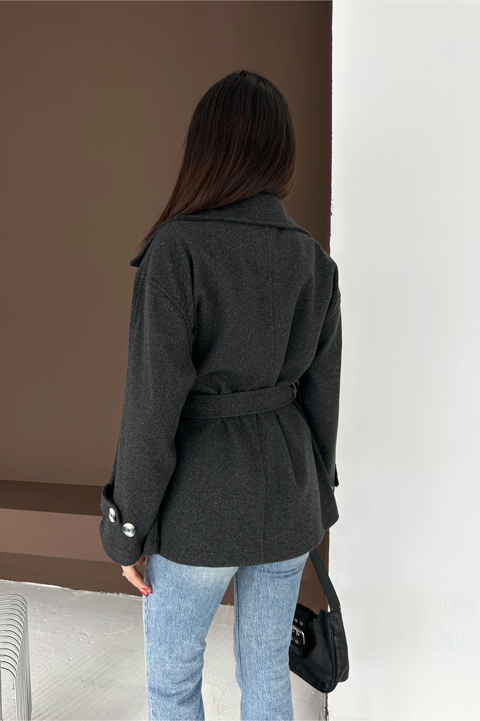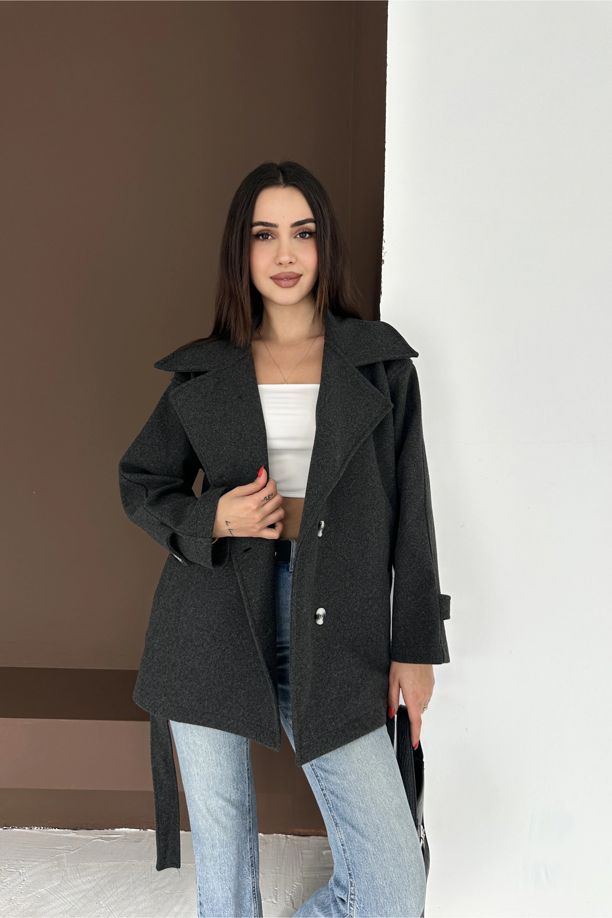 Belden Bağlamalı Düğmeli Kısa Kaşe Kaban