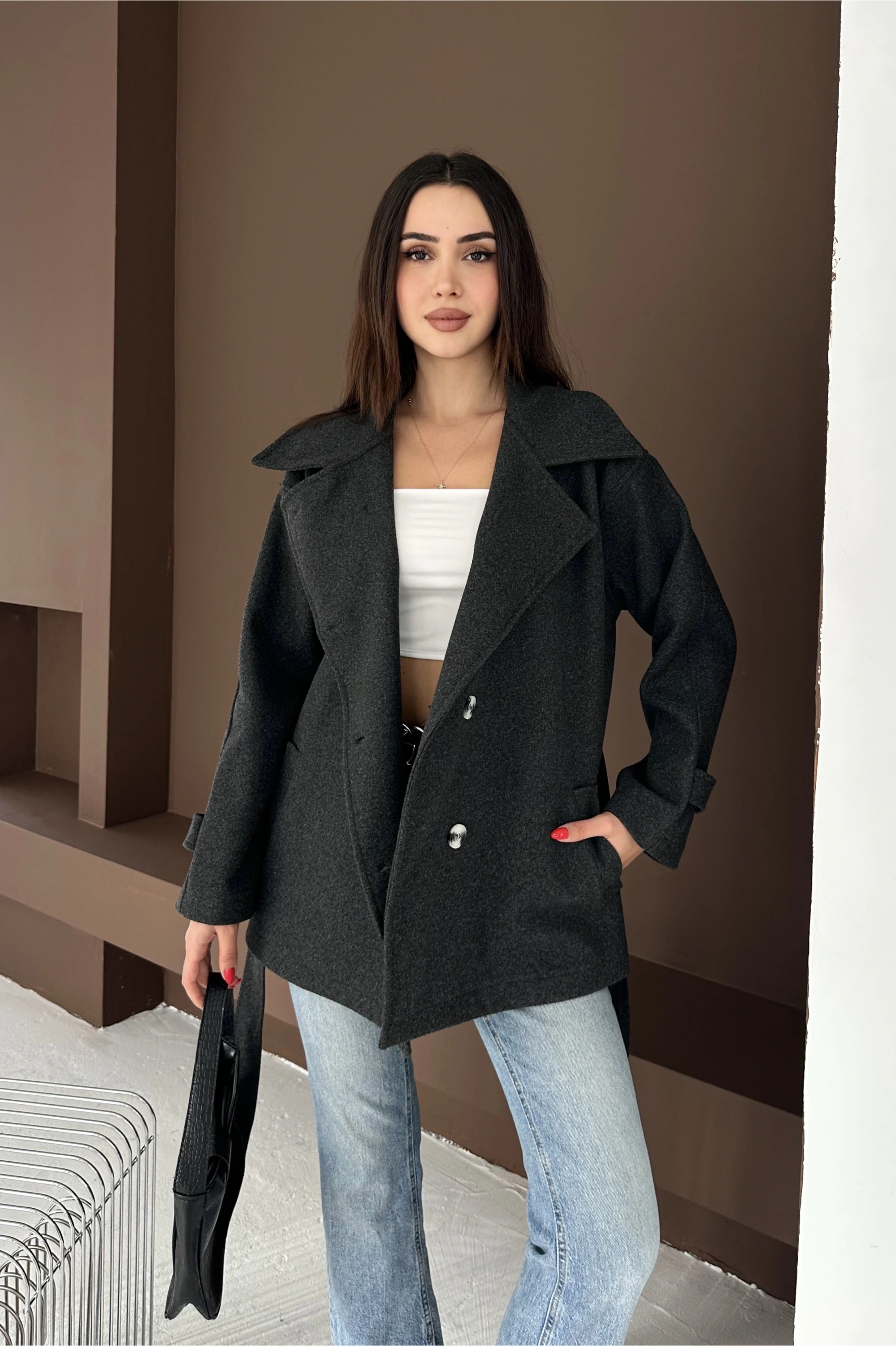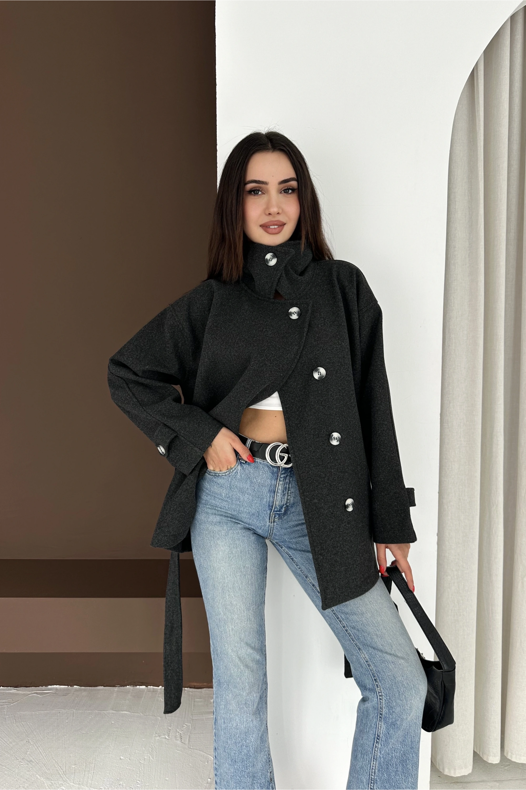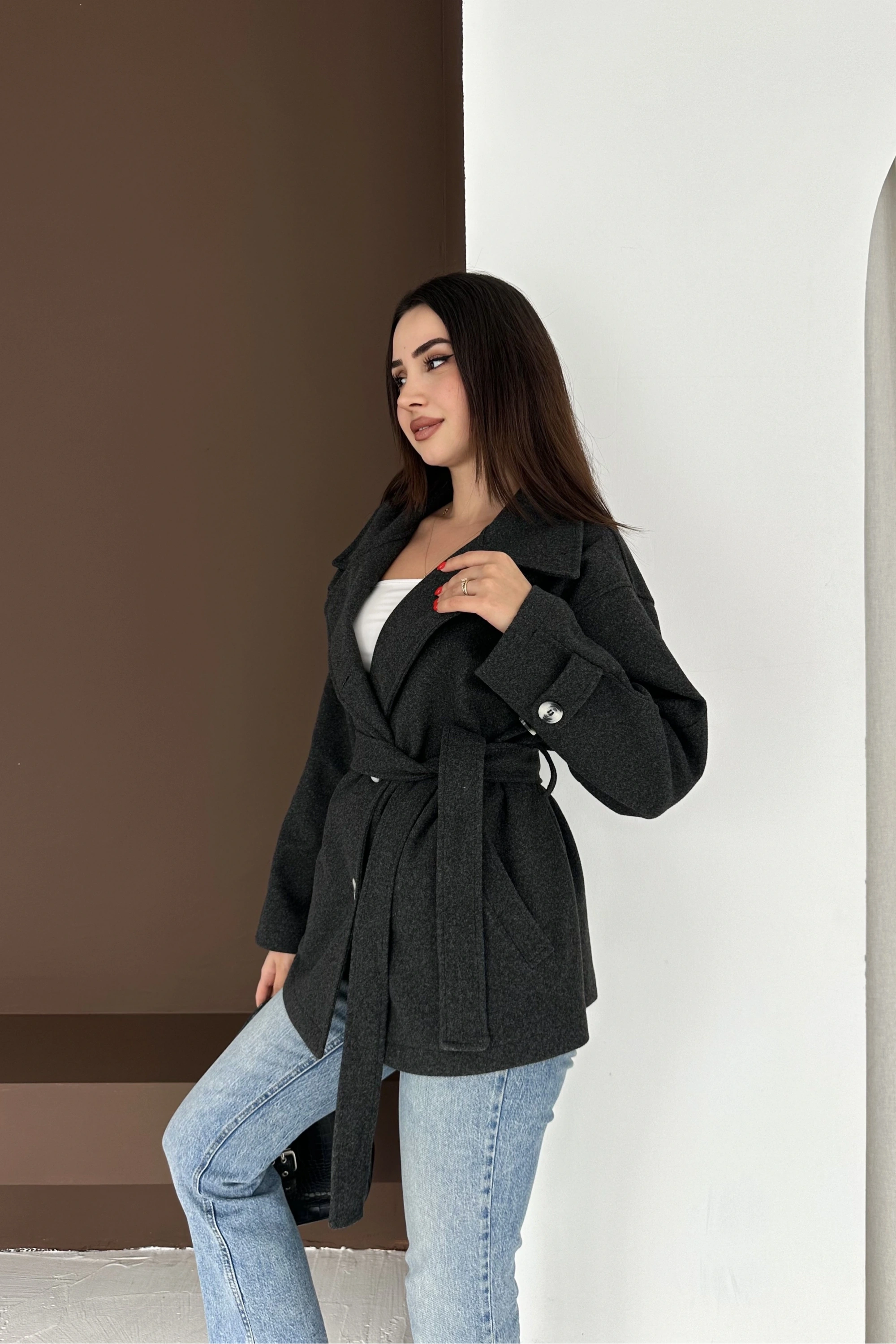 Belden Bağlamalı Düğmeli Kısa Kaşe Kaban