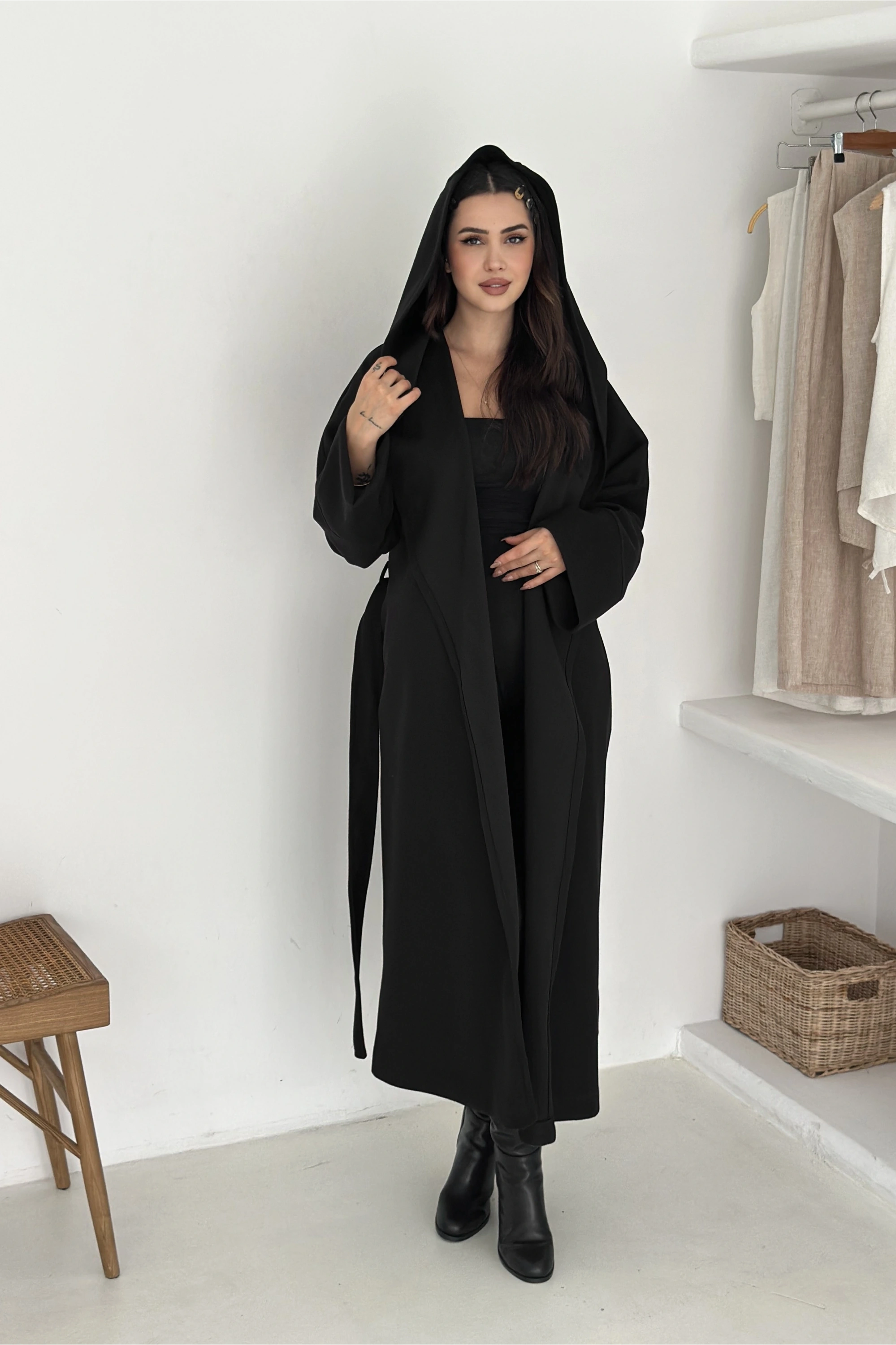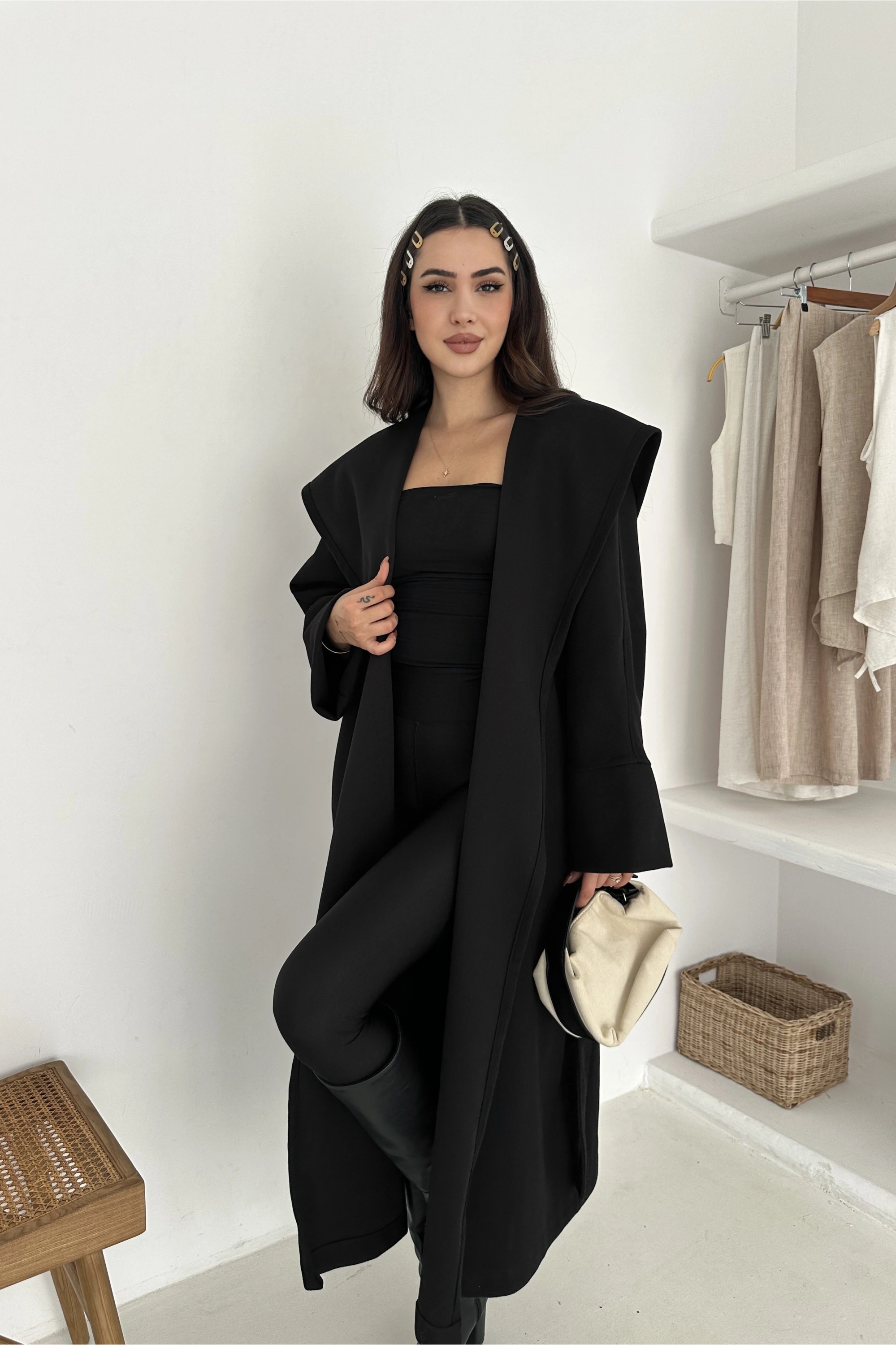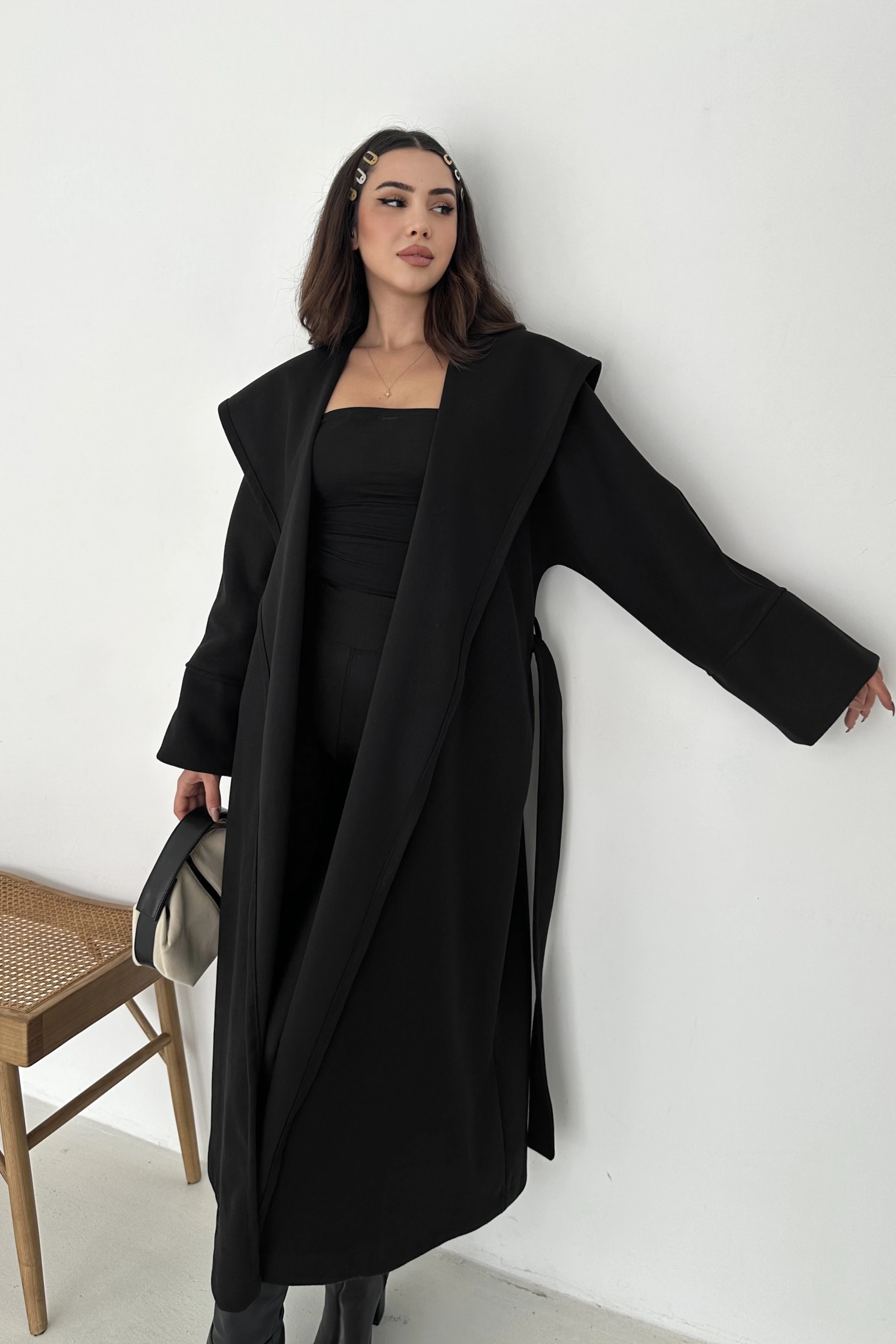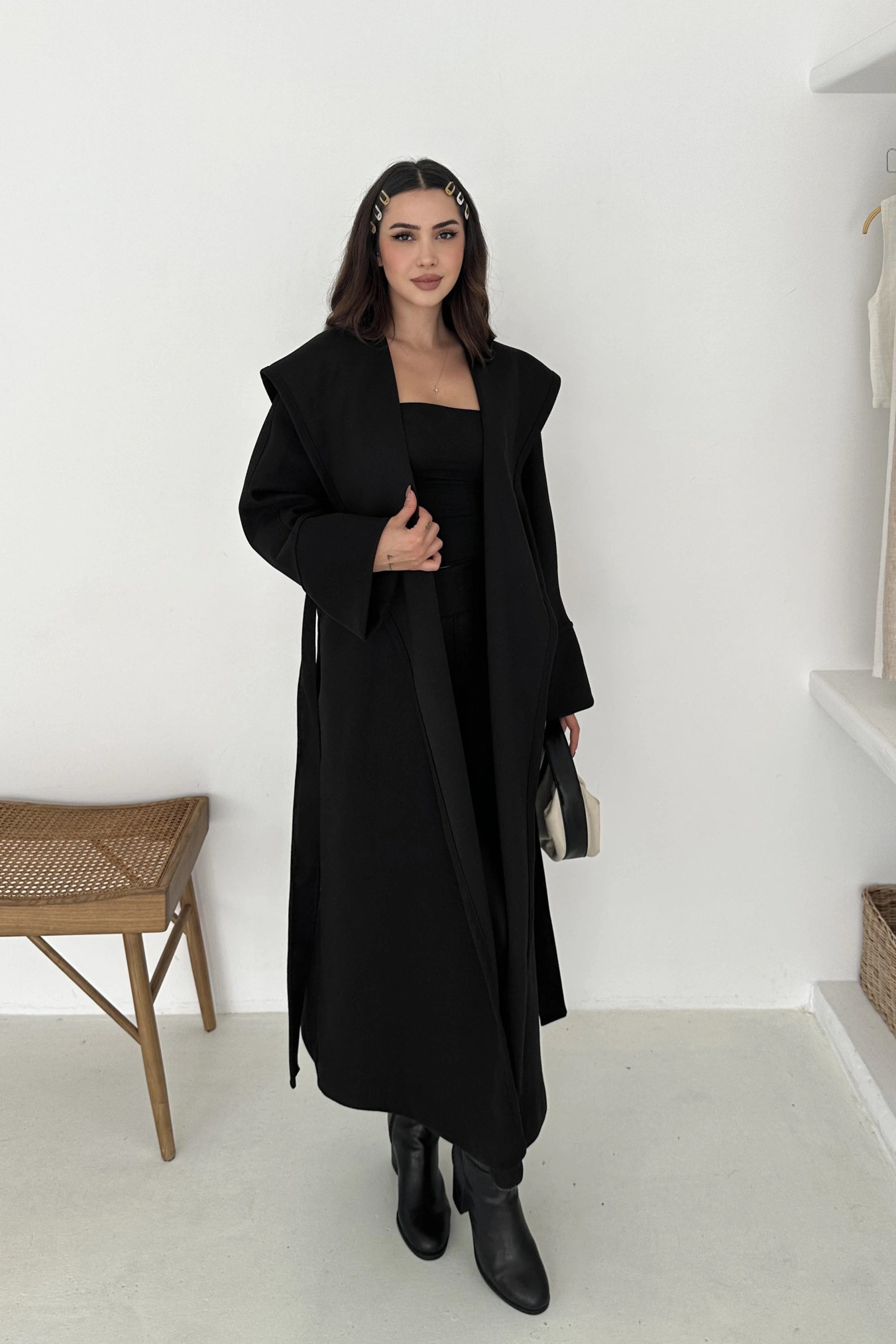 Belden Bağlamalı Uzun Kapşonlu kaşe Kaban