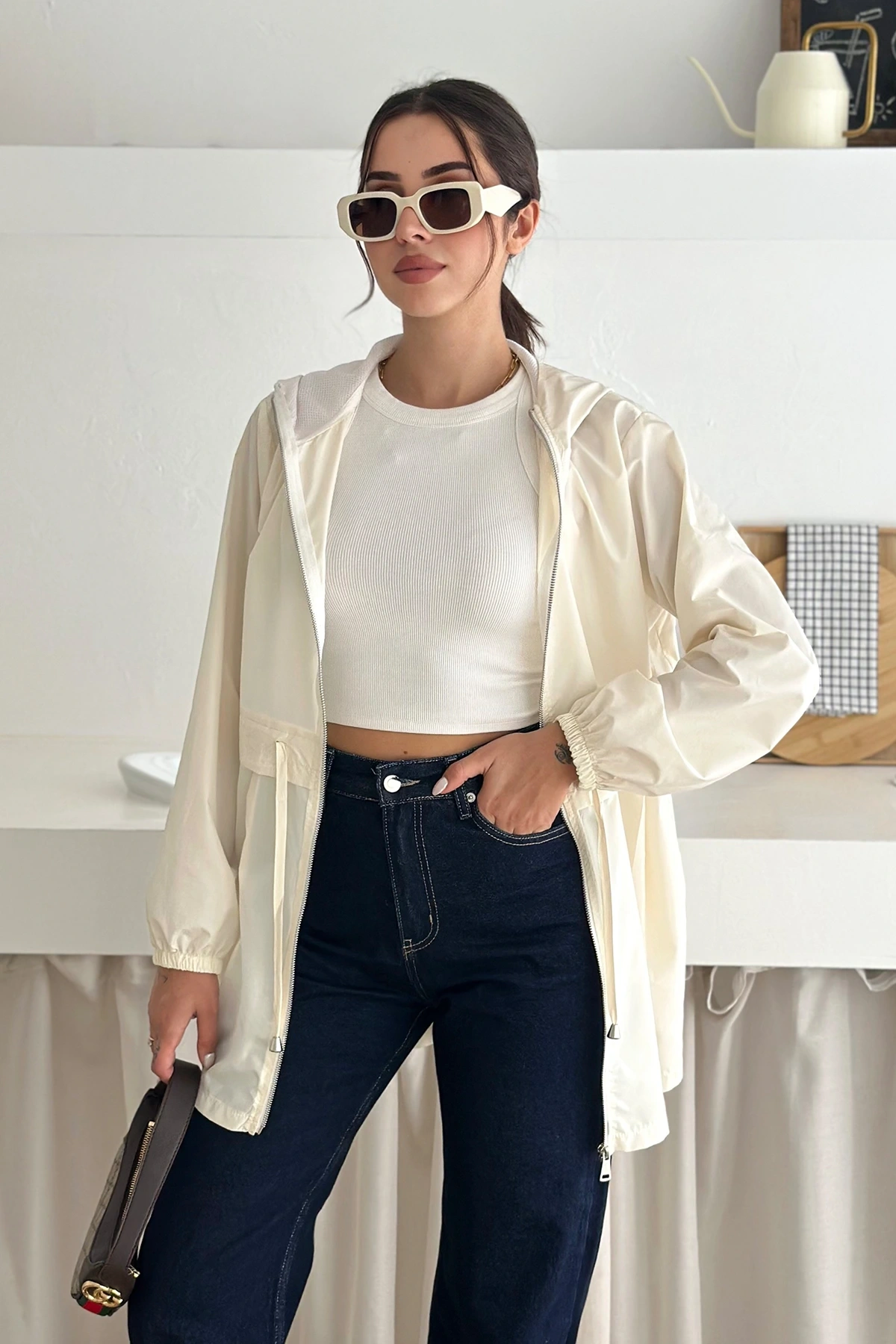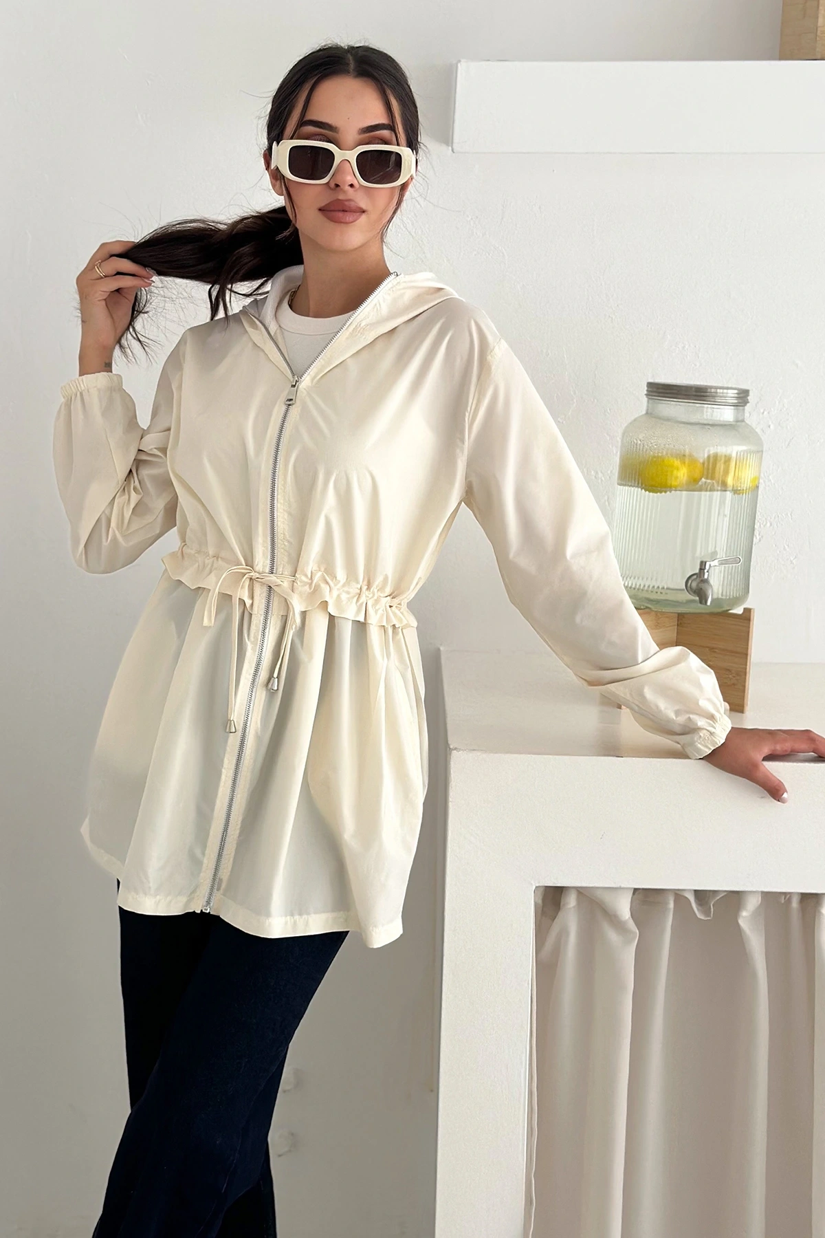Kapşonlu Fermuarlı Bağcıklı Uzun Yağmurluk