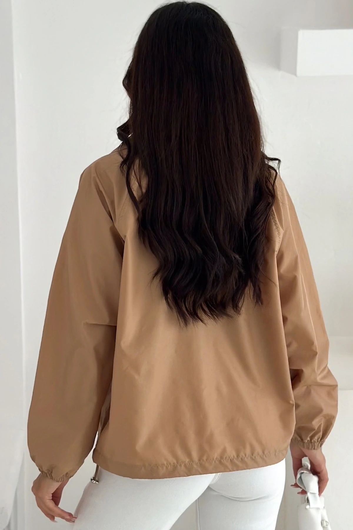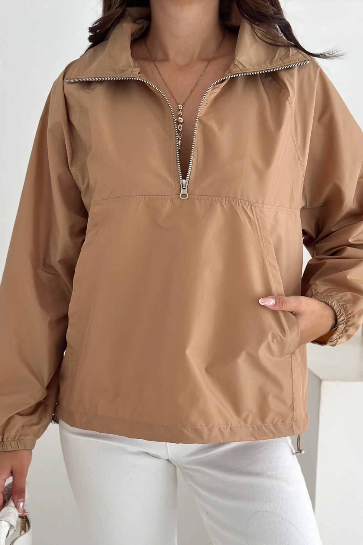 Yarım Fermuarlı Stoperli Camel Renk Yağmurluk